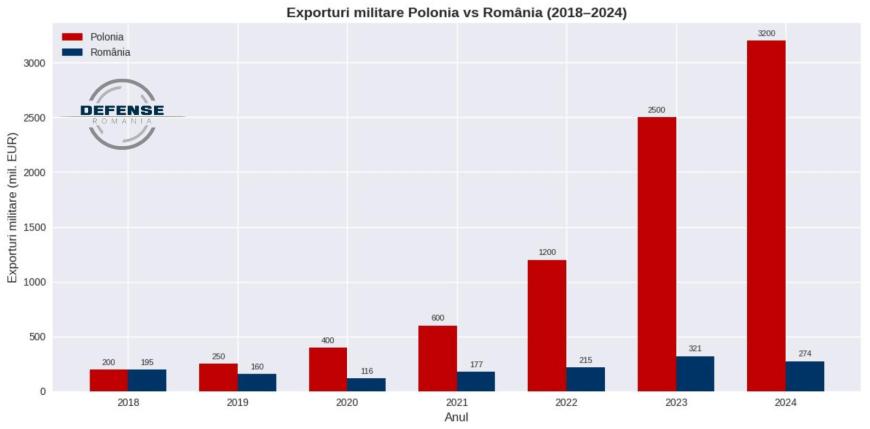 Faptul că am pornit de la același nivel nu e mit. Spre exemplu, în privința exporturilor, chiar și în 2018 eram la același nivel: Polonia exporta armament în valoare de 200 de milioane de euro, România în valoare de 180 de milioane. După 2020 lucrurile s-au rupt abrupt; în timp ce industria noastră a bătut pasul pe loc, Polonia a înregistrat o explozie fulminantă terminând anul cu exporturi de aproximativ 600 de milioane de euro, în comparație cu 177 ale României. În baza ultimelor cifre oficiale pe anul 2024, diferența e covârșitoare iar cifrele sunt cu adevărat amețitoare. Polonia a exportat armament în valoare de 3.2 miliarde de euro, în timp ce România a rămas la 274 de milioane.