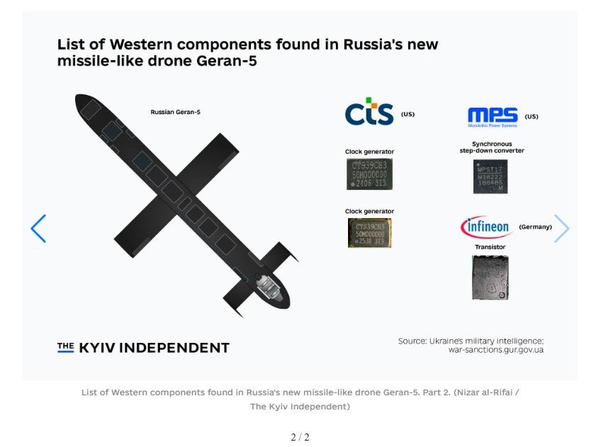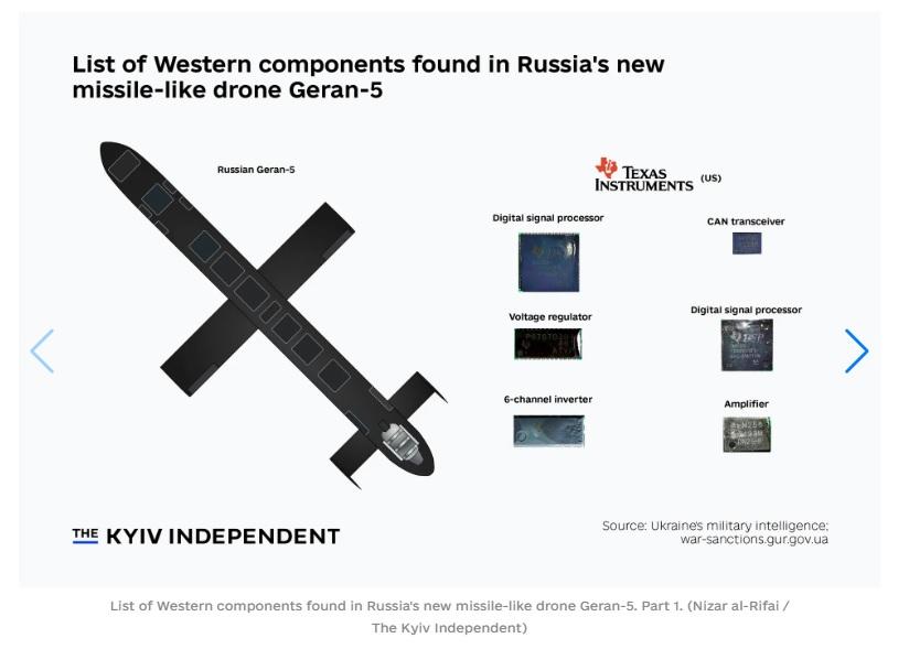 Analiza „post-mortem” efectuată de serviciile de informații militare ucrainene (GUR) asupra unui exemplar doborât în ianuarie 2026 a scos la iveală prezența unor componente critice de la giganți tehnologici americani precum Texas Instruments, CTS Corporation și Monolithic Power Systems.