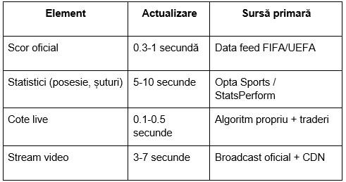 Provocarea e că toate trebuie să coexiste în aceeași aplicație. Utilizatorul vede scor actualizat instant, dar imaginea încă arată faza anterioară. Platformele bune rezolvă prin design - scorul e separat, cotele au mini-delay indicator, video-ul are watermark "~5sec delay".