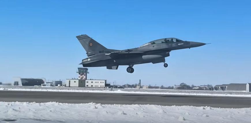 F-16 al României, în timpul unor manevre de decolare în condiții de iarnă. Foto: Baza 86 Aeriană Borcea @Screenshot