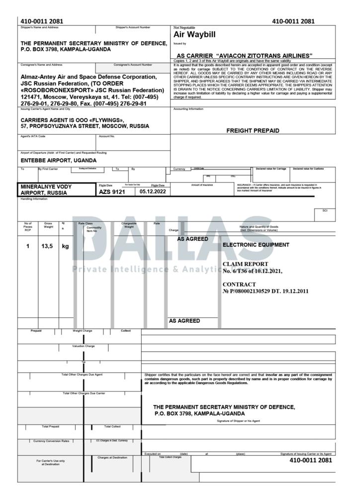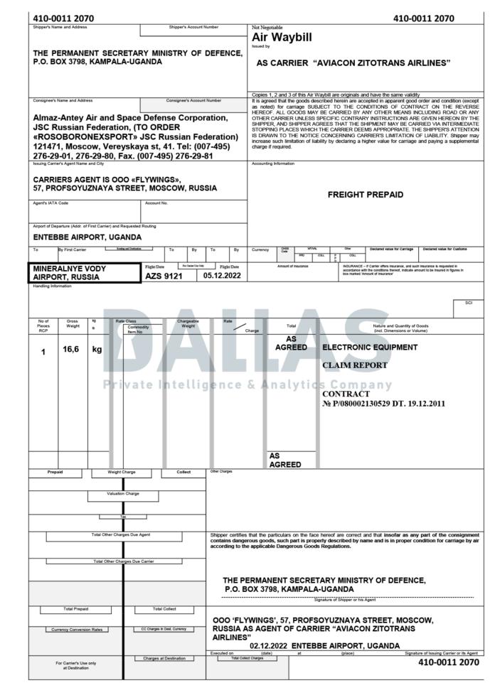 Informațiile obținute de analiști din documentația de zbor de tip AWB (Air Waybill) și din evidențele vamale probează livrarea de elicoptere militare către Laos, sisteme de rachete către India și mai multe transporturi de armament către Siria. Mai mult, aeronavele acestor companii au preluat echipamente electronice militare din Uganda pentru a asigura necesarul componentelor de apărare antiaeriană dezvoltate de consorțiul Almaz-Antey, entitate vizată de sancțiuni internaționale.