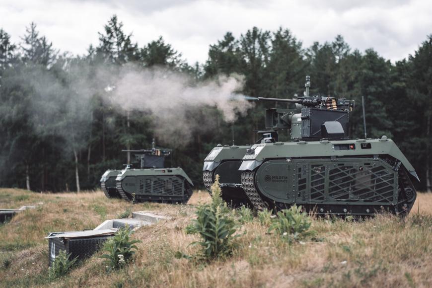Un vehicul terestru fără pilot Milrem Robotics TheMIS echipat cu o stație de armament telecomandată în timpul unor teste. Sursa foto: Milrem Robotics.