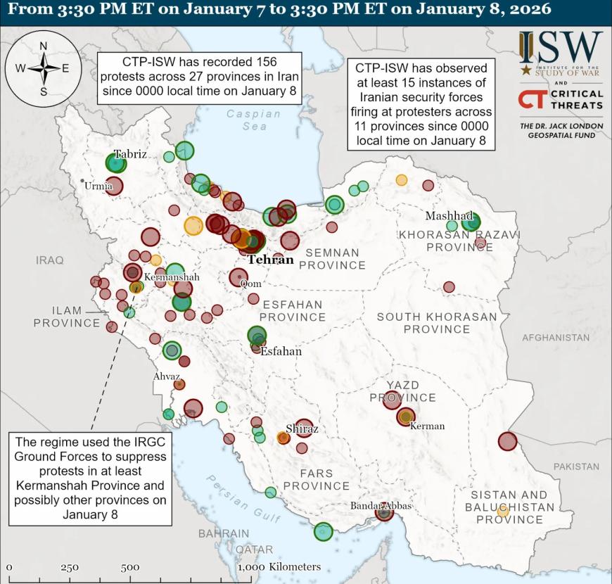Probabil că regimul a stabilit că aceste proteste reprezintă o amenințare extrem de gravă la adresa securității și și-a intensificat represiunea, inclusiv prin luarea rarei măsuri de a utiliza Forțele Terestre ale Corpului Gărzilor Revoluționare Islamice (IRGC) pentru a suprima protestele cel puțin în provincia Kermanshah și, posibil, în alte provincii, pe 8 ianuarie. Provincia Kermanshah, unde există rapoarte despre activitatea Forțelor Terestre ale IRGC, are o populație kurdă numeroasă.