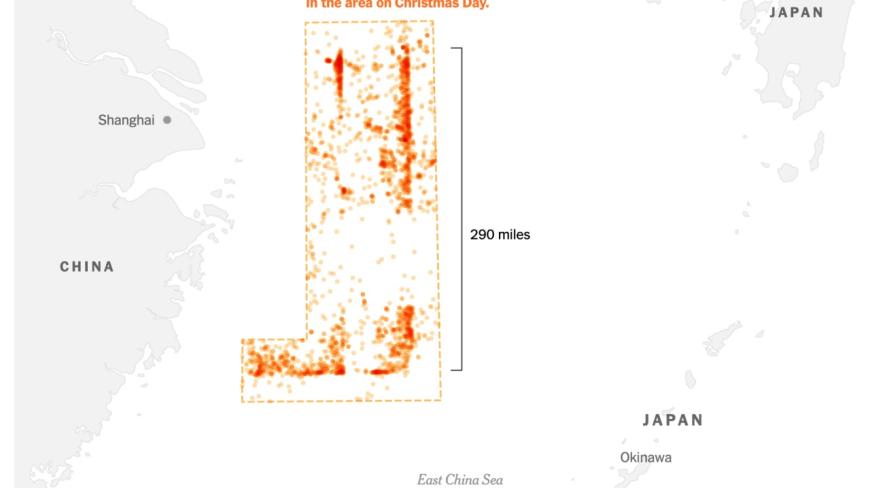 Două săptămâni mai târziu, o altă formațiune de 1.400 de vase a creat un dreptunghi dens de 320 de kilometri lungime, forțând navele cargo internaționale să execute manevre de evitare sau să navigheze în zig-zag pentru a trece.